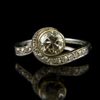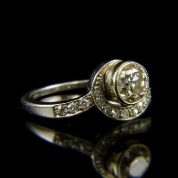 | Solitaire platinum ring with an old-cut diamond in the middle of the bouton setting (cca: 0.80 ct, old-cut 1, VLy, Vs), with some more small diamonds on the ring shoulders (cca: 0.14 ct). Gross: 4.2 grams. Ring size: 51 Beginning of 1900s. Posterior, domestic platinum hallmark of 950 of fineness, used between 1999-2006. | |