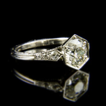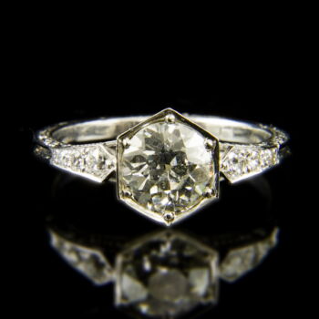| 14 K solitaire-shaped white gold ring with an old-cut diamond in the middle of a hexagonal setting (approx. 1,523 ct, old-cut 1, TCr, Si2), with an additional 3-3 small diamonds on the ring shoulders (approx. 0.163 ct in total). Gross: 2.6 grams. Ring size: 56. Marked: domestic gold hallmark with a fineness of 585, used since 2016. | |