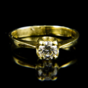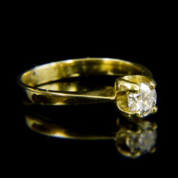 | 14 K gold solitaire ring in a four-prong setting with a brilliant cut diamond (approx. 0.40 ct, M1, W, Si1). Gross: 2.6 grams. Ring size 52. Signed: domestic gold hallmark with a fineness of 585 used between 2006 and 2016. | |