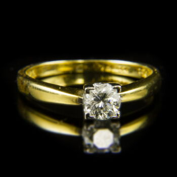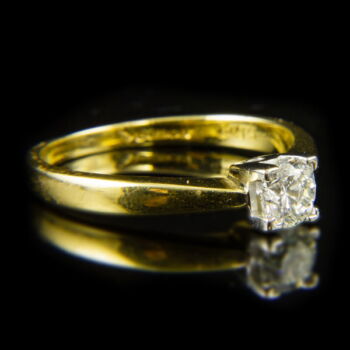 18 K gold engagement ring with a brilliant-cut diamond in the 4-prong setting (cca: 0.50 ct, M1, W, Vs1). Gross: 3.5 grams. Ring size: 56. Signed: import hallmark used 1999-2006 of 750 of golden fineness.