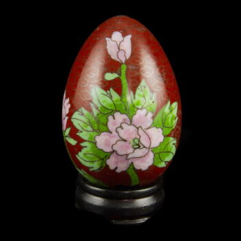 | Egg decorated with colorful floral motifs (pink chrysanthemum) on reddish-brownish base. On a small lacquered wooden base. Dimensions: together with the base: 8,5 cm, d: 4,5 cm. China, first half of XXth century. | |