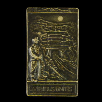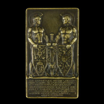 Bronze plaque commemorating the restoration of the Miechoweri tunnel (1915. I. 11. - II. 15.). Viribus Unitis. 7.5 x 4.5 cm. "ZUR ERINNERUNG AN DIE WIEDER HERSTELLUNG DES MICHOWERTUNELS DER VON OSTERREICH-UNGARN-DEUTSCHEN-RUSSEN GESPRENGT VON K.U.K. EISENBAHNTRUPPEN UND DER FIRMA BRUDER REDLICH. U. BERGER WIEDER HERGESTELLWURDE . 11. I. BIS. 15. II. 1915." |