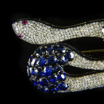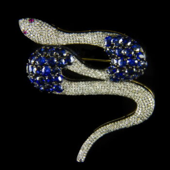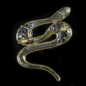 | Snake-shaped brooch with 14 K gold frame and pin, 37 blue sapphires in a silver setting (total approx. 7.60 ct), 532 achtkant-cut diamonds (total approx. 5.23 ct), 1-1 small rubies (approx. 0.04 ct) ct). Gross: 18.4 grams. 55 x 55 mm. | |