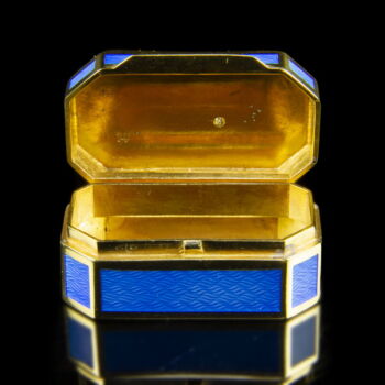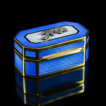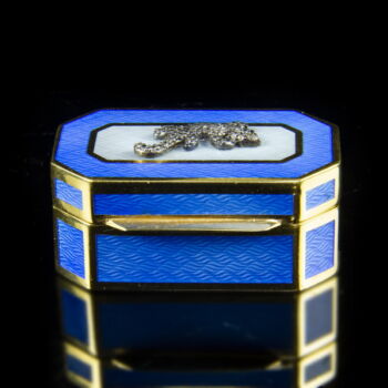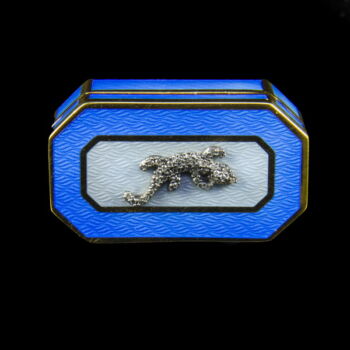| 88 Zolotnyik gilded silver rectangular box with cut corners. Salamander inlaid with diamonds on the hinged lid. Cover and side panels covered with blue luster enamel. 20 x 25 x 40 mm; 41.48 grams. Marked: XX. century Russian 88 Zolotnyik fineness hallmark. | |