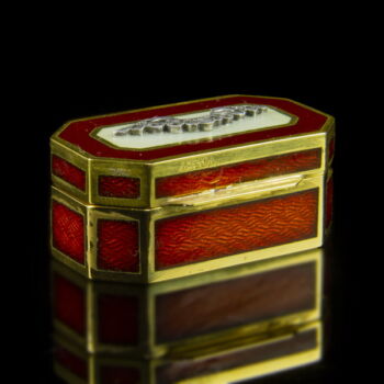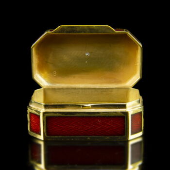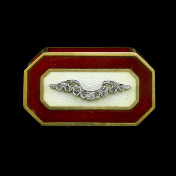 | 88 Zolotnyik gilded silver rectangular box with cut corners. Wing-like decoration with diamonds on the hinged lid. The top and sides are covered with red luster enamel. 20 x 25 x 40 mm; 36.05 grams. Marked: XX. century Russian, with 88 Zolotnyik fineness hallmark. | |