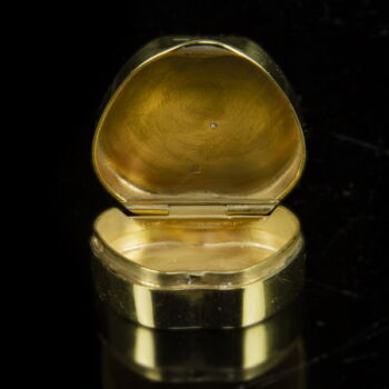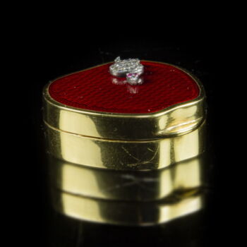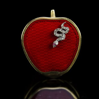 | Apple-shaped, 88 Zolotnyik gilded silver medicine box. Snake appliqué with red luster enamel cover and achtkant-cut diamonds (23 pieces, approx. 0, 115 ct) and rubies (2 pieces of Cca. 0.01 ct) on the hinged lid. 23.87 grams; 12 x 32 x 47 mm. | |