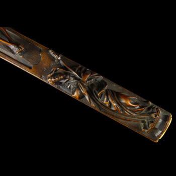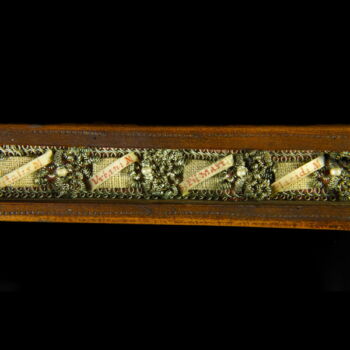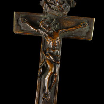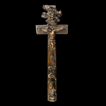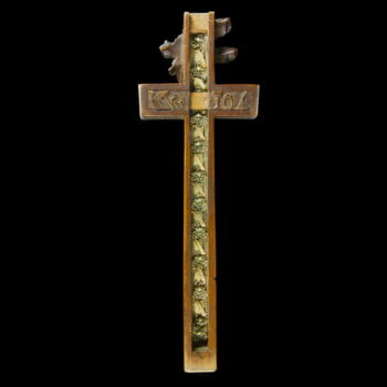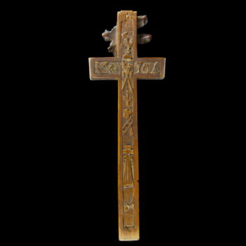 Carved wooden crucifix, on its back there is a sliding back decorated with symbols. In its interior part there are textile-metal ribbon relics with inscriptions. Frm around 1800. Dimensions: 29 x 10 x 1,5 cm. |