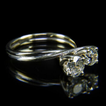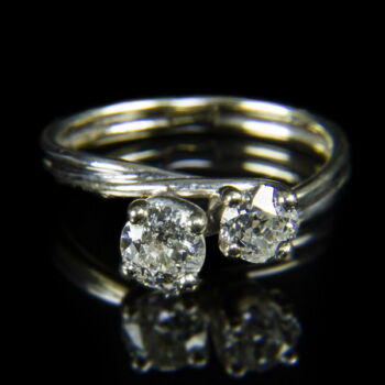 | In the 18 K white gold setting there are 1-1 old-cut diamonds (total approx. 0.90 ct (0.40 ct and 0.50 ct) (old-cut 1; TCr; Vs-Si1)). Gross: 3.95 grams. Marked: posterior domestic gold hallmark with a fineness of 750, used from 2016. Ring size: 54.5. | |