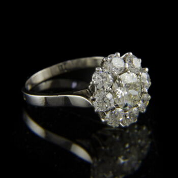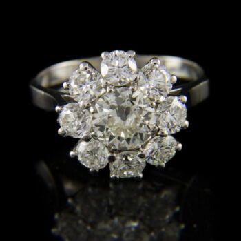 | 900 fineness rosette-shaped platinum ring with an old-cut diamond in an eight-prong setting in the center (approx. 1.25 ct, M2, TC, VVs1), surrounded by 10 diamonds (total approx. 2 ct, M1, W, VVs-Vs). Gross weight: 6.3 grams. Ring size 56. Marked: French 900 fineness platinum hallmark used from 1912 and a subsequent conventional hallmark. | |