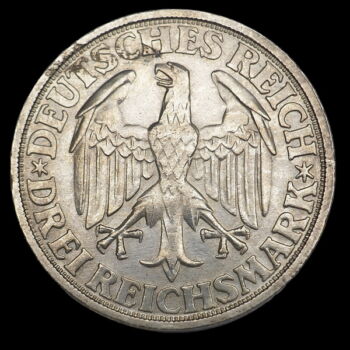 Germany. Weimar Republic. 3 Mark, 1928 D. Dinkelsbühl. Struck for the 1000th Anniversary of the founding of Dinkelsbühl. Obverse: DEUTSCHES REICH DREI REICHSMARK. German eagle. Reverse: TAUSEND·JAHRE·DINKELSBÜHL 1928. Representation of the city of Dinkelsbühl with a farm worker in the center, legend around. Edge: EINIGKEIT UND RECHT UND FREIHEIT. Weight: 14.99 grams. Diameter: 30 mm. Fineness: 500 %. VF |