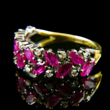 | 14 K gold ring rail, with 11 navette-cut rubies set in silver (total approx.: 1.59 ct) and 11 octagonal-cut diamonds (total approx. 0.26 ct). Ring size: 54. Gross weight: 2.9 grams. Hallmarked: with a posterior 585 fineness conventional gold hallmark. | |