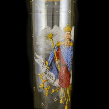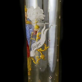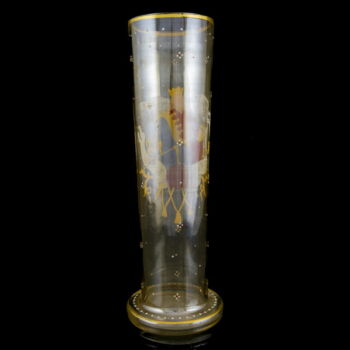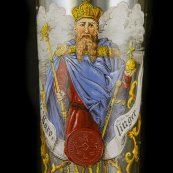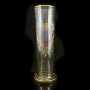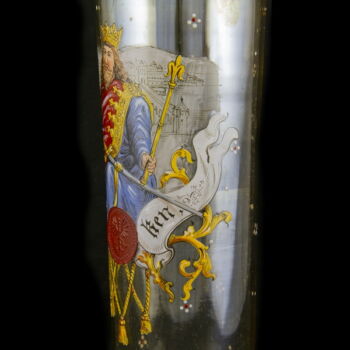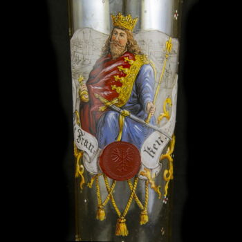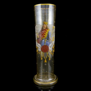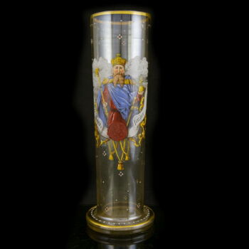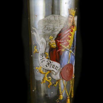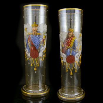 | Pair of large glass vases/jugs with painted royal portraits. Colorless glass, cylinder-shaped mantle on a round base, painted on the outside with portraits of French kings, German inscriptions (Die Karolingen, Die Franken). Height: 30.5 cm, diameter: 8.5 cm. Without marking. End of the 19th century, historicism. Volume: 1250 ml. | |