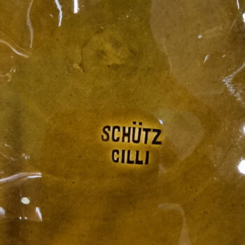 Painted, glazed earthenware, d: 42.5 cm. Marked: with Schütz Cilli maker's mark pressed into mass.