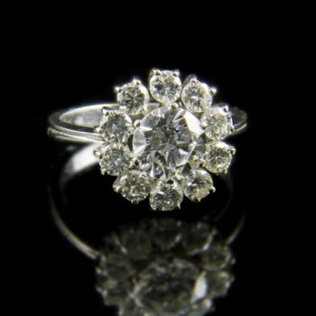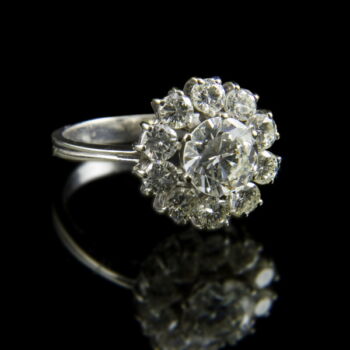 | 18 K white gold rosetta ring with one brilliant-cut diamond in the centre (cca: 1.5 ct, M, TCr, VVs), there are 10 smaller diamonds surrounding it (cca: 1 ct, M, TCr, VVs). Gross weight: 4.9 gr. Ring size: 55. | |