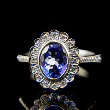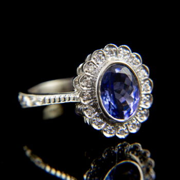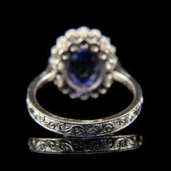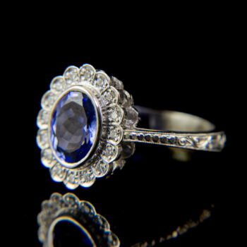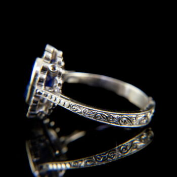 | 14 K white gold, 4.60 grams. In the middle of the rosette-shaped ring head, we have 1 larger, oval-shaped tanzanite: approx. 2.1 ct; 16 small modern brilliant-cut diamonds in a circle around it: approx. 0.20 ct. (M1; W; Vs1). Marked: with a Hungarian hallmark used since 2016. Engraved ring rail, ring size: 55. | |