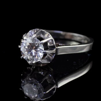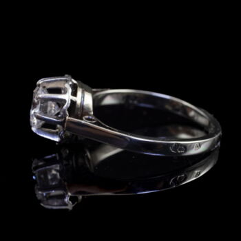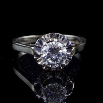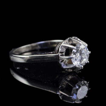 18 K white gold, 3.3 grams; 1 larger, modern brilliant-cut diamond in an eight-pronged chaton setting: approx.0.82 ct. (M1;TCr;VVs1). Marked: with a Hungarian hallmark used between 1966-1999. Ring size: 51.