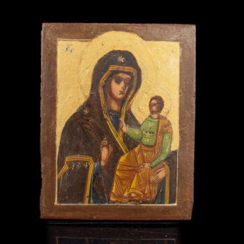 Miniature Orthodox icon painted on a wooden board: Mother of God with the child Jesus in her arms. Dimensions: 11 x 8.5 cm. Second half of the 20th century, Russia.