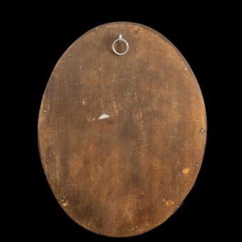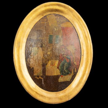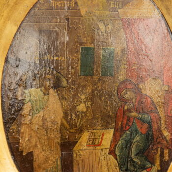 Oval-shaped icon in a gilded wooden frame: Representation of the Angel's greeting. Wooden board hand-painted with oil, dimensions: 27 x 21 cm. Russia, first half of the 19th century. Restored in places.