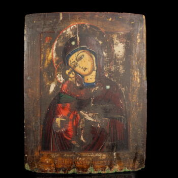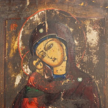 | Oil on wooden panel, hand-painted icon of Feodorovskaya Mother of God with baby Jesus in her arms. Dimensions: 30 x 23 cm. Russia, end of the 19th century. It is damaged in several places, the paintwork is worn. | |