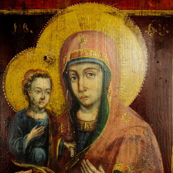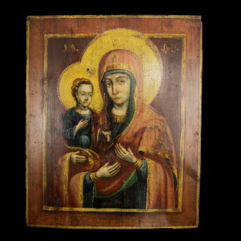 Hand-painted icon with oil on wooden panel depicting the Three-Handed Mother of God with baby Jesus in her arms. Dimensions: 53 x 43 cm. Russia, XIX century.