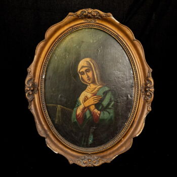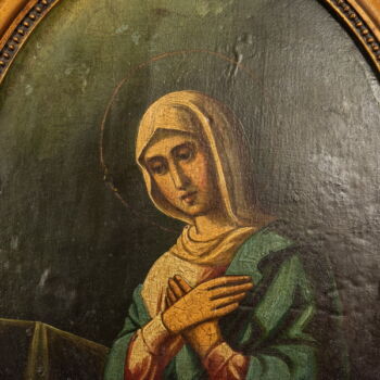 Hand painted, oil, canvas mounted on wooden board. In an oval-shaped, gilded blondel wooden frame. 36 x 26 cm. End of 19th century, beginning of the 20th century.