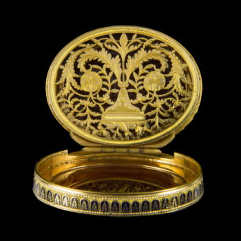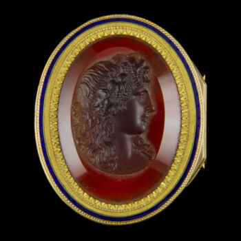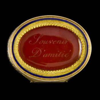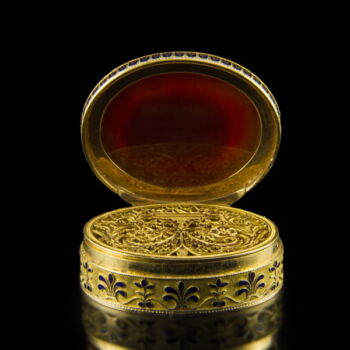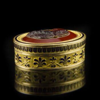 | Antique French golden vinaigrette with carved carnelian cameo and blue enamel decoration. Oval shape. Dimensions: 13 x 38 x31 mm. Gross weight: 38 gr. On its lid we have a carved portrait carnelian cameo, on its base we have an oval cameo sheet with a carving in it: Souvenir D'amitié (Memory of friendship) inscription. XIXth century. | |