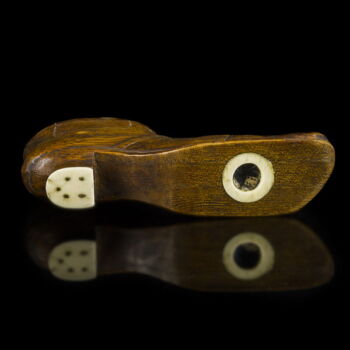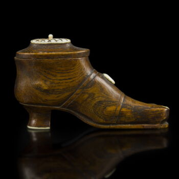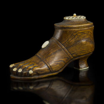 Carved wooden foot with bone inlays and dice, with a detachable lid. 7.5 x 11.5 x 3 cm.