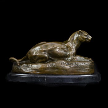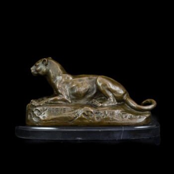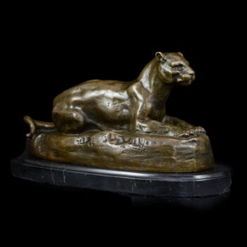 Oval-shaped modern, cast bronze reclining panther figure on a black marble plinth. Dimensions: 14 x 24.5 x 12 cm. Signed: BARYE.