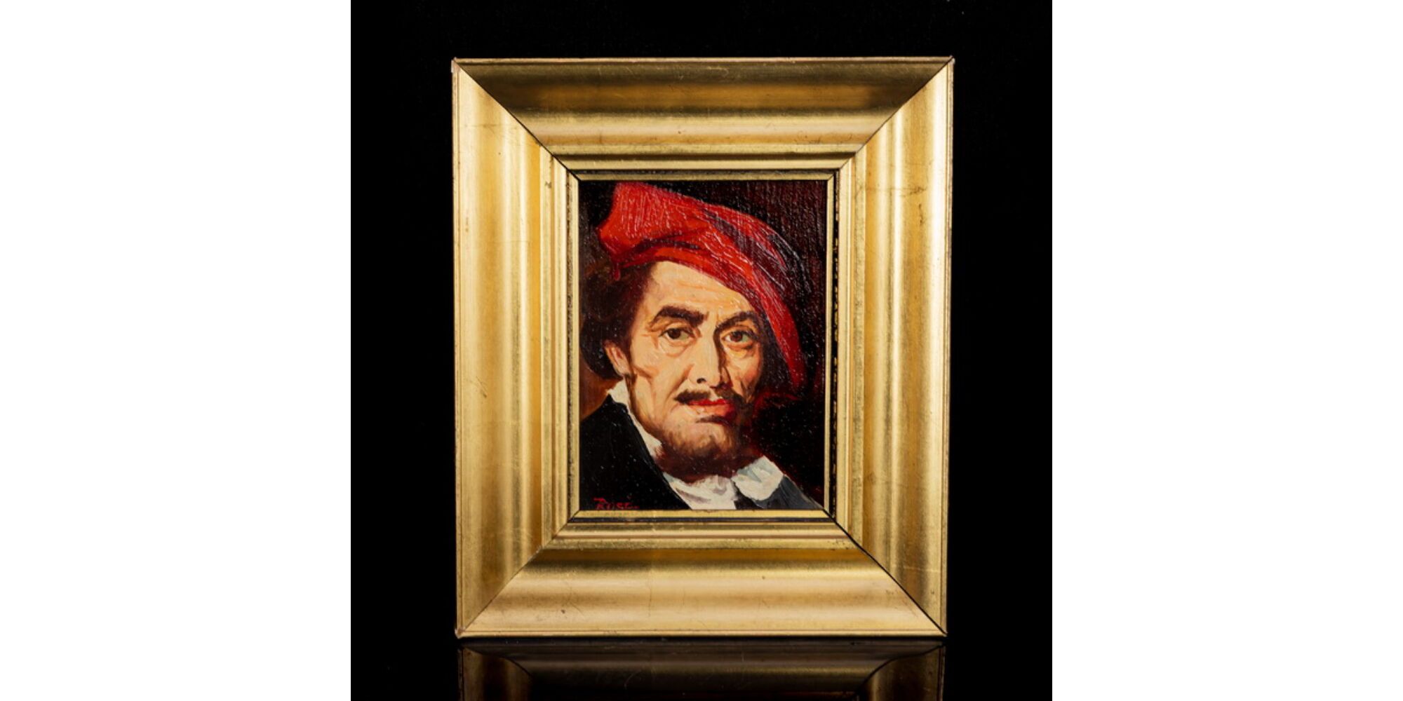 A portrait of a man painted in oil on wood in a wide, gilded wooden frame. Dimensions: 18 x 14 cm; including frame: 28 x 24 cm. Marked: with an unsolved "ROSE" mark.