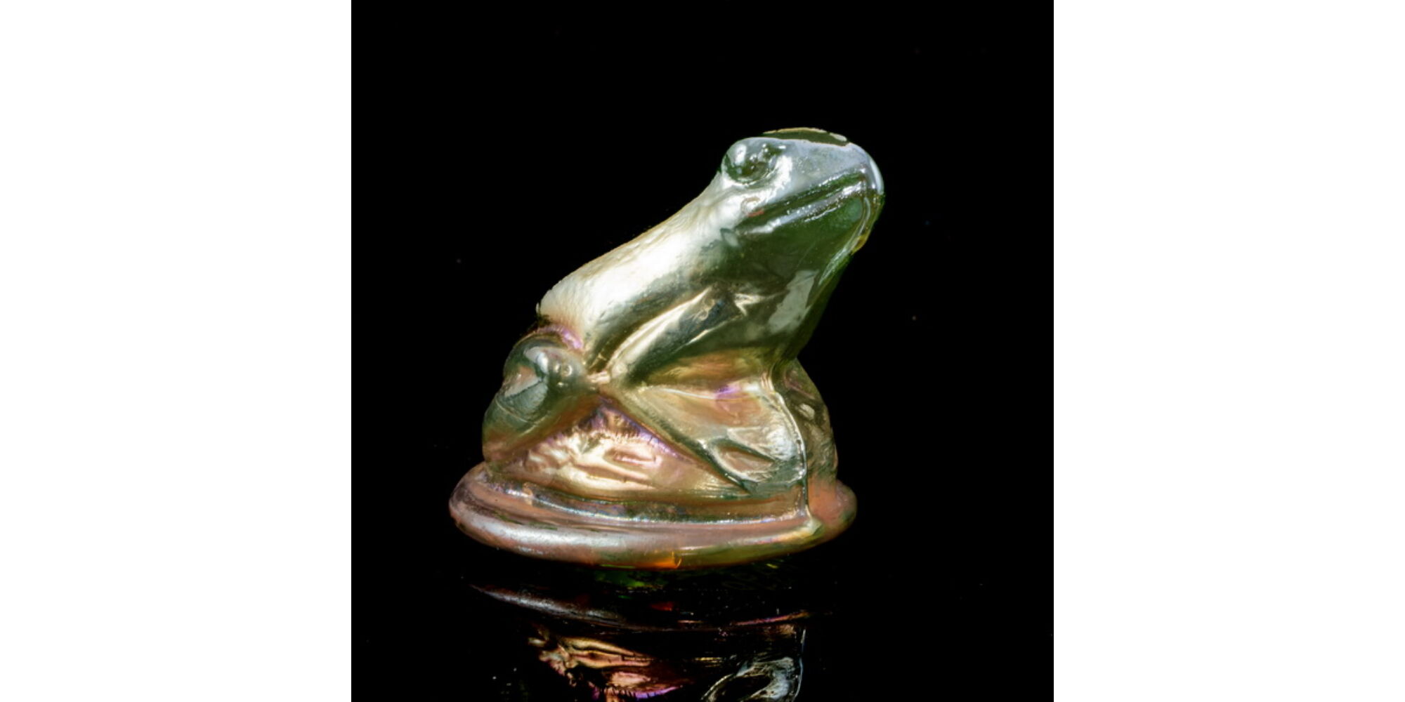 Molded, self-colored glass frog figurine with iridescent surface decoration. Dimensions: 5.5 x 6.5 x 5.5 cm. Marked: JB 1990 Parád Hungari engraved maker's mark.