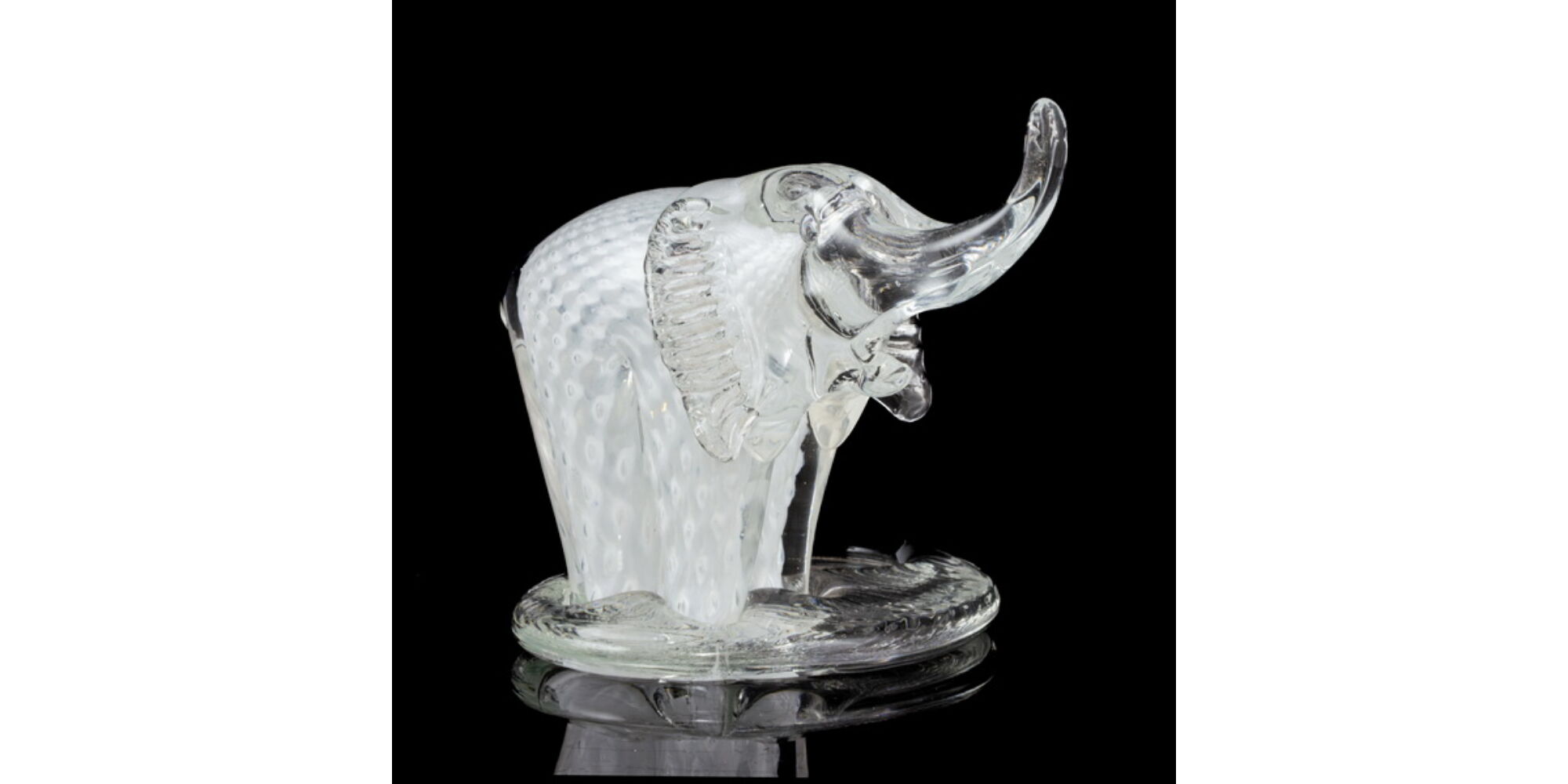 A self-blown clear glass candle holder as an elephant figure, dimensions 11 x 13 x 13.5 cm. Circa 1990. Marked: JB Parád engraved maker's mark.