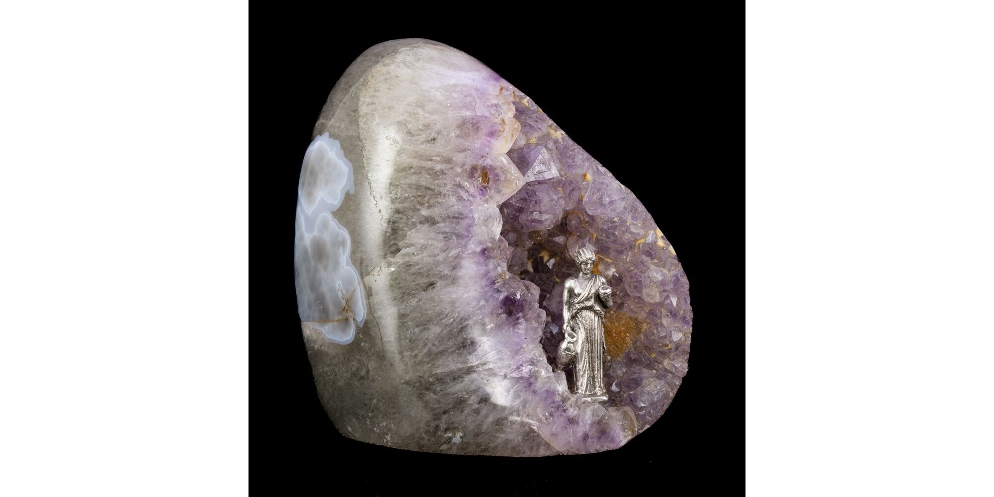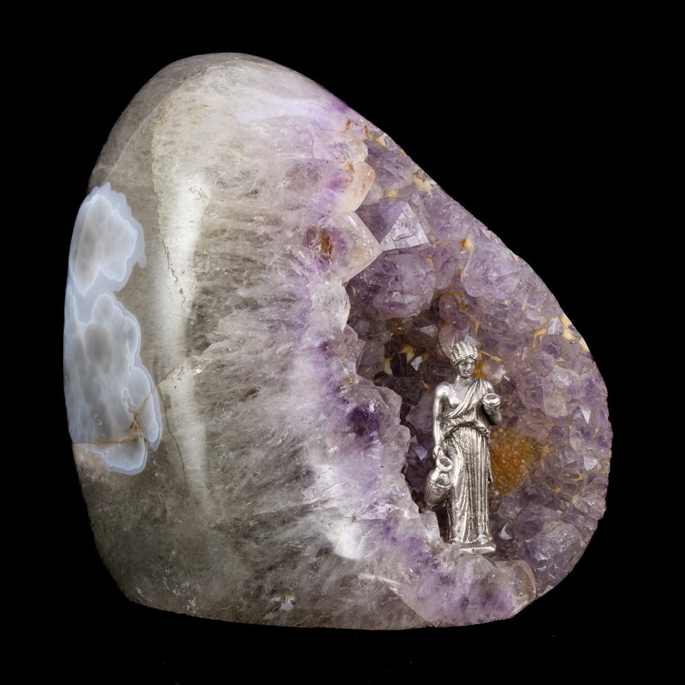 Részben kabochon csiszolt ametiszt tömb méretei: 2,5 x 10 x 21 cm; ráaplikált öntött ezüst szobrocska, fiatal nőalak vizes korsókkal. (feltehetően XX. század eleje). Szobrocska mérete: 8 x 2,7 x 2 cm. Nettó 142 gramm. Jelzés nélkül.