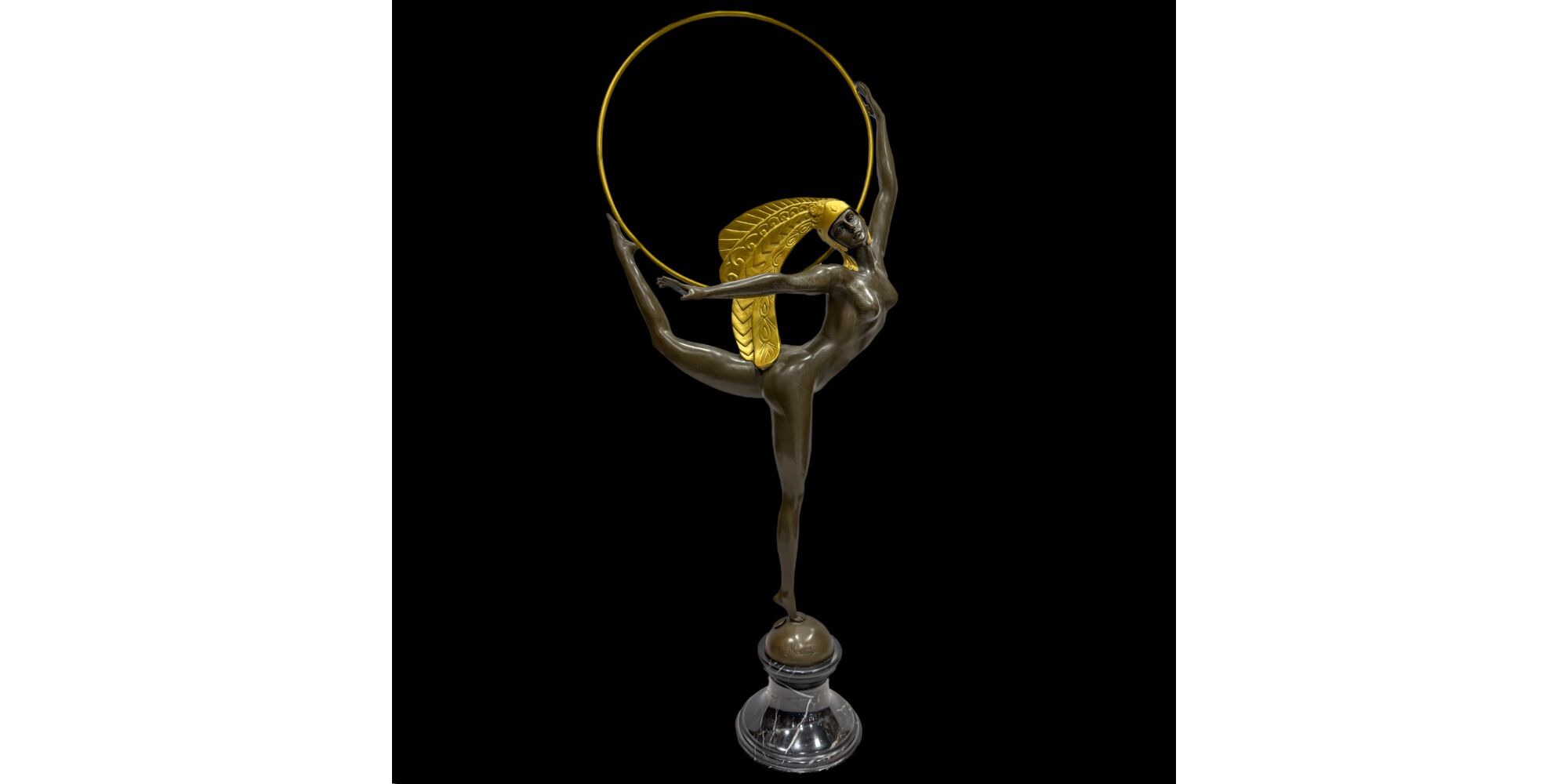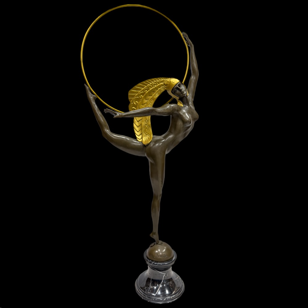 Arany festett, öntött bronz szobor, art deco táncosnő karikával, fején toll dísszel. Fekete márvány talapzaton. Méretei: 68,5 x d: 26,5 cm. Jelzett: Morante. XX. század vége.