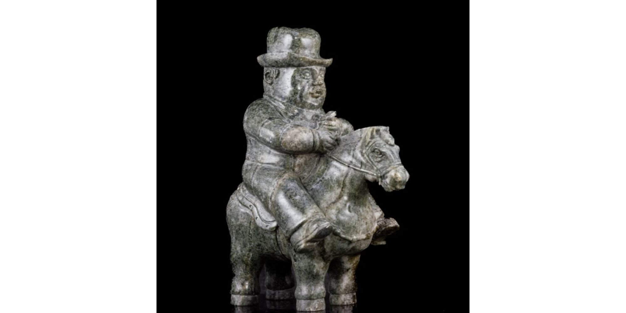 A patterned figure carved from a block of green agate: a wealthy man on horseback. Dimensions: 20.5 x 16 x 10 cm. Modern. Unmarked.