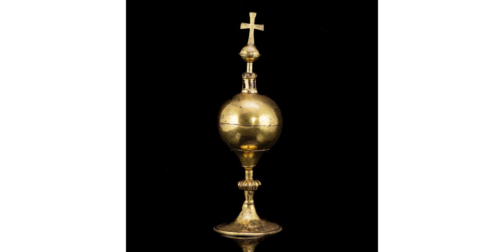 Late Gothic / early Renaissance fire-gilded copper lidded wafer cup (ciborium). Round base, spherical body riveted on a decorated node, removable lid with a Gothic bastion and a cast, chiseled Latin cross. Impressive 15th - 16th century, presumably French goldsmith's work. Height: 32.5 cm.