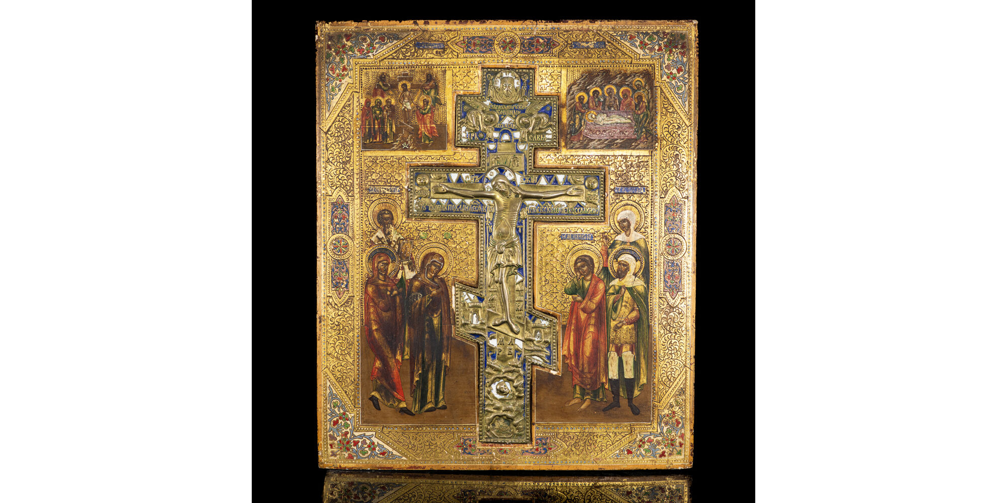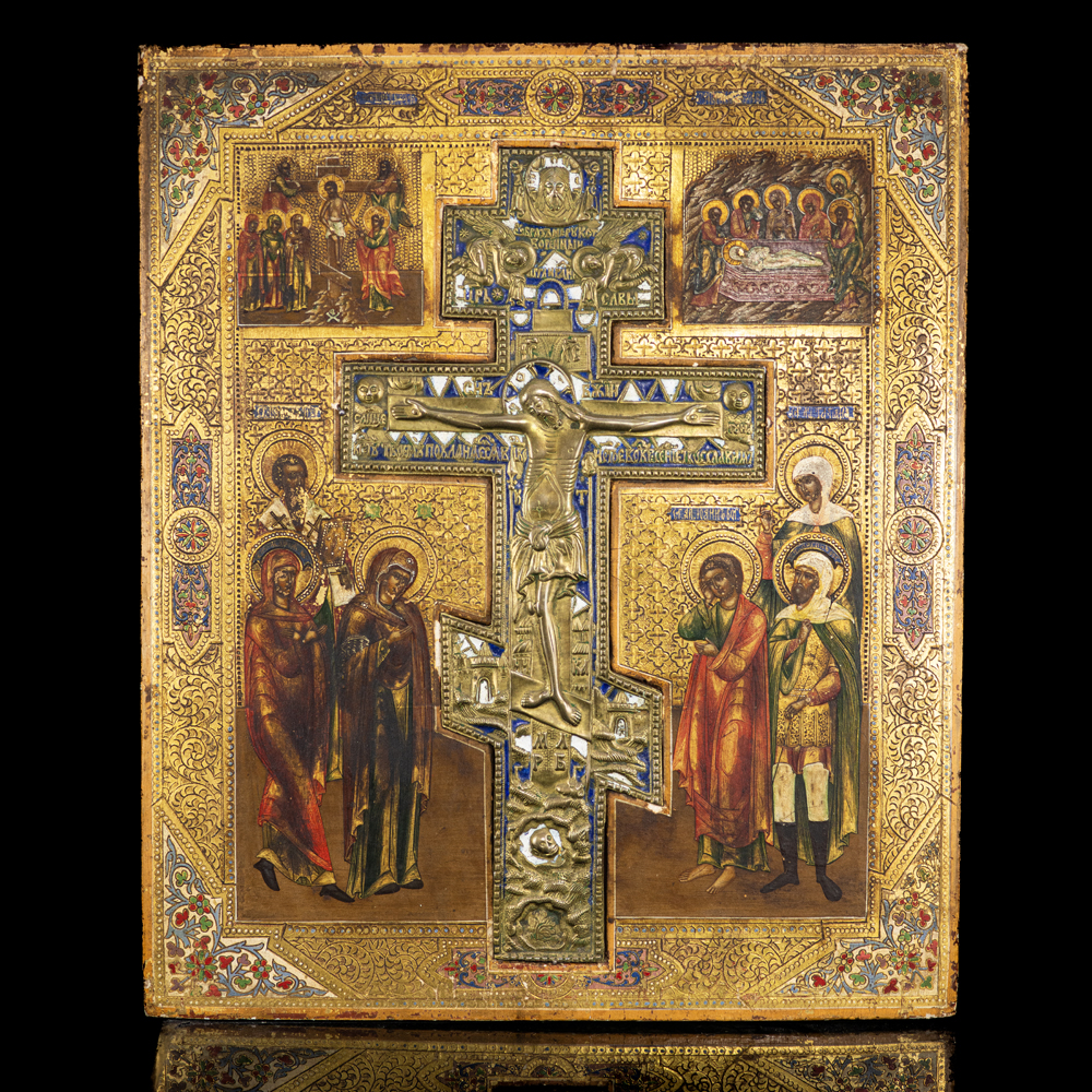 Large, hand-painted Russian icon on a wooden panel depicting the crucifixion of Christ. In place of the icon insert there is a cast bronze Orthodox crucifix decorated with blue and white enamel, surrounded by a composition painted in tempera. Next to the cross there are three figures on each side, on the left the Virgin Mary, Mary Magdalene, and a male saint, on the right the apostle Saint John, presumably Centurion Longinus, and a female saint. The icon shows the taking down of Jesus from the cross in the upper left corner, and the enthronement of Jesus in the upper right corner. Colorful painting imitating floral enamel work on the sides and corners. Mid-19th century, Tsarist Russia. Size: 44.5 x 37.5 cm. An extremely impressive and iconographically complex icon. In good condition for its age, with minor wear.