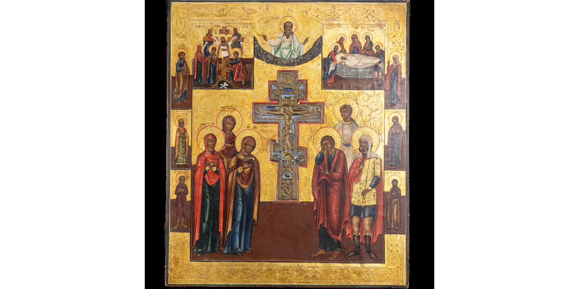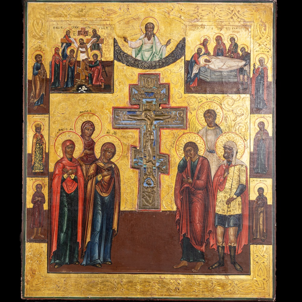 Nagyméretű, fa táblára kézzel festett orosz ikon, Krisztus keresztrefeszítésének ábrázolásával. Az ikonbetét helyén egy világos- és sötétkék zománccal díszített, öntött bronz ortodox/pravoszláv feszület található, amelyet temperával festett kompozíció vesz körül. A kereszt mellett két oldalt három-három alak áll, balra Szűz Mária, Mária Magdolna, és Mária (Kleofás felesége), jobbra Szent János apostol, feltehetően Longinus százados és egy angyal. Az ikon bal felső sarkában Jézus levétele a keresztről, jobb felső sarkában Jézus sírbatétele látható. Oldalt további három-három szent alak ábrázolásával. XIX. század közepe, cári Oroszország. Mérete: 44 x 37 cm. (Bronz kereszt mérete: 19.5 x 10.5 cm). Rendkívül impozáns és ikonográfiailag összetett ikon. Korának megfelelő állapotban, apró kopásokkal, néhány helyen restaurálás nyomával.