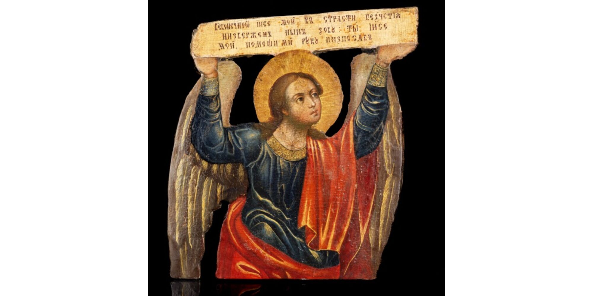 An Orthodox icon depicting an archangel, hand-painted on a wooden panel, which was presumably part of an iconostasis. Above the archangel's head he holds a scroll with a Cyrillic prayer to Christ and a request for His intercession ("My infinite Jesus, in the depths of passions and misfortunes, save me. My Jesus, help me, Your servant"). 18th-19th century, Russian. Size: 32x30 cm.