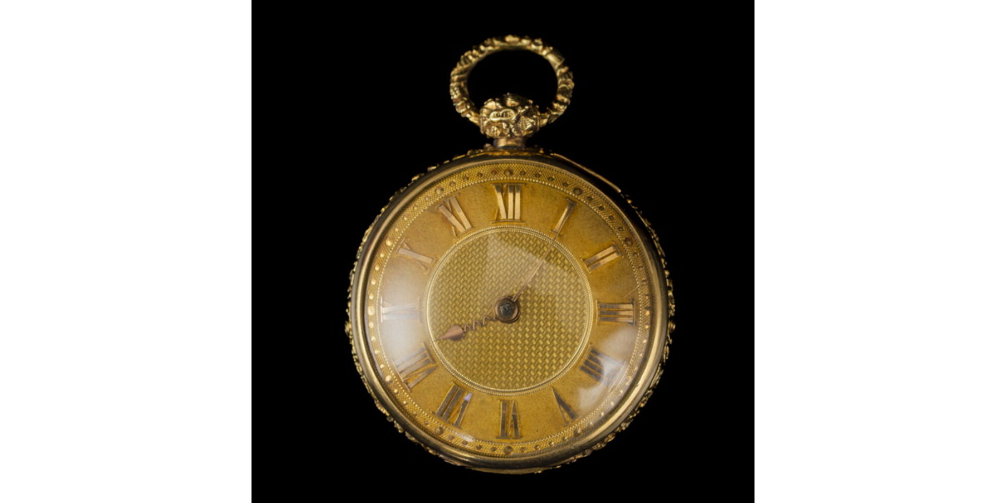 English gold case pocket watch with Roman numerals, gilded dial, key-winding, mechanical mechanism, motifs decorated with oaks, flowers and leaves on the edge. Marked: 1820 London, 18 K gold hallmark. Gross: 90.89 grams. Case diameter: 47 mm. It works! With key, box.