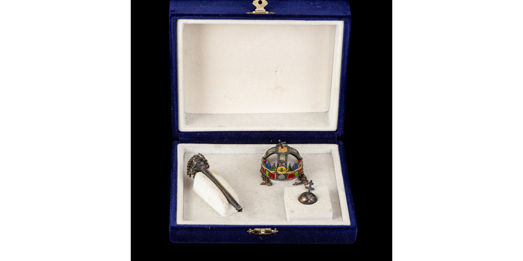 Magyar Királyi koronázási ékszerek miniatűr másolata dobozzal