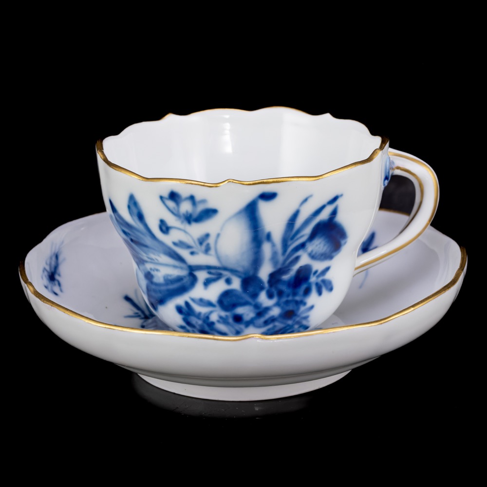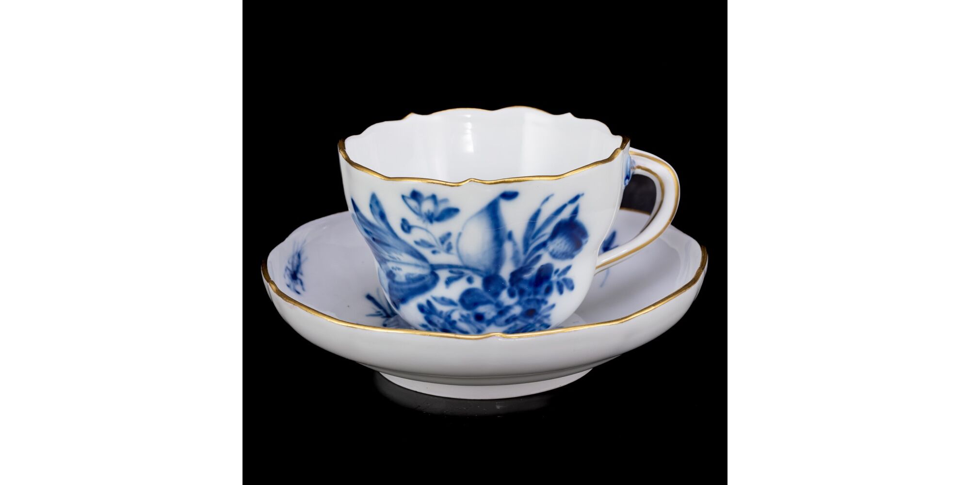 Máza alatt kékkel festett virágcsokor és rovarokkal dekorált kávéscsésze és alj, arannyal festett peremmel. Csésze méretei: 6,5 x d:10,5 cm. Csészealj: d:13 cm. Jelzett: XIX. század vége-XX. század eleje.