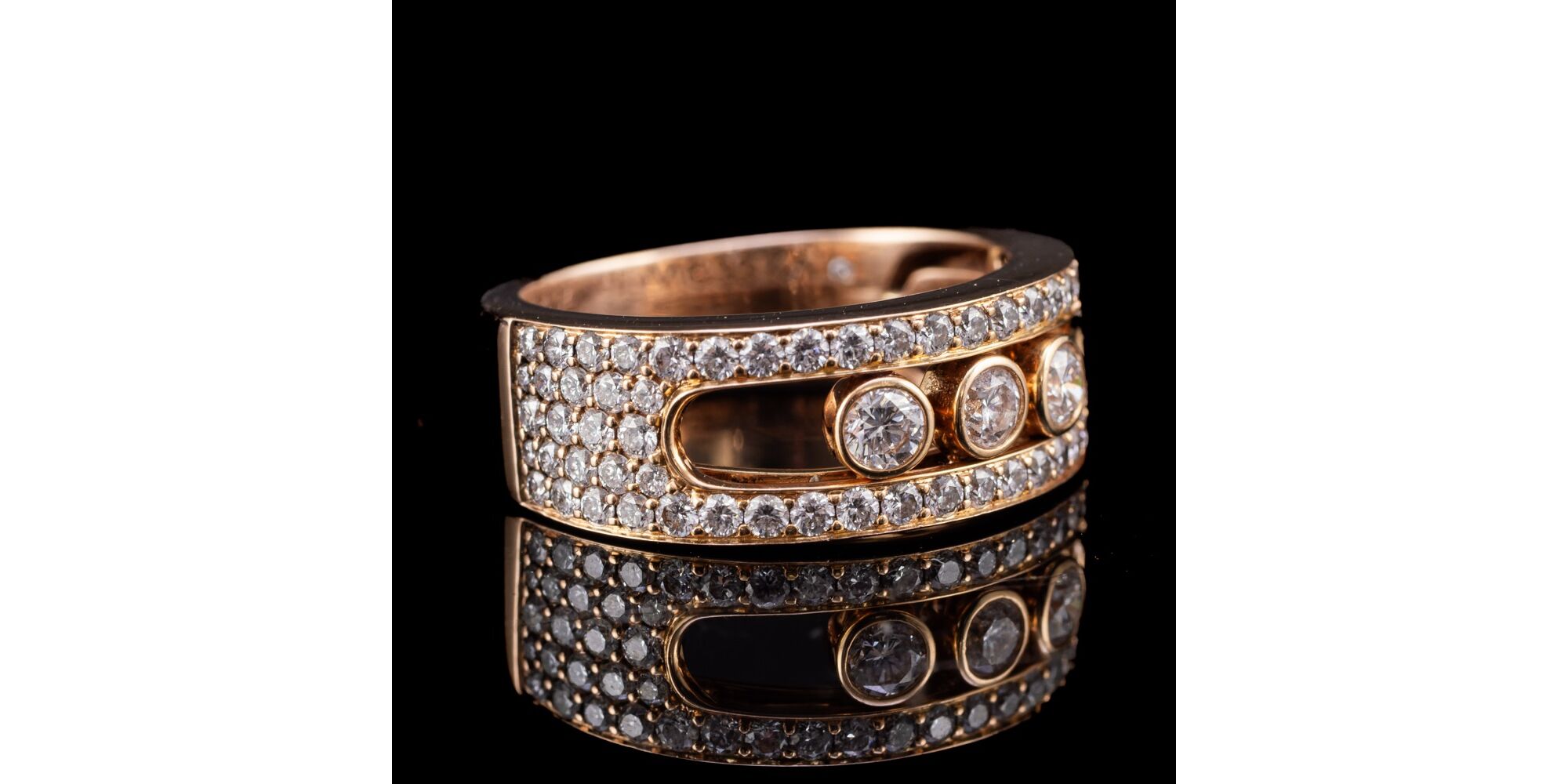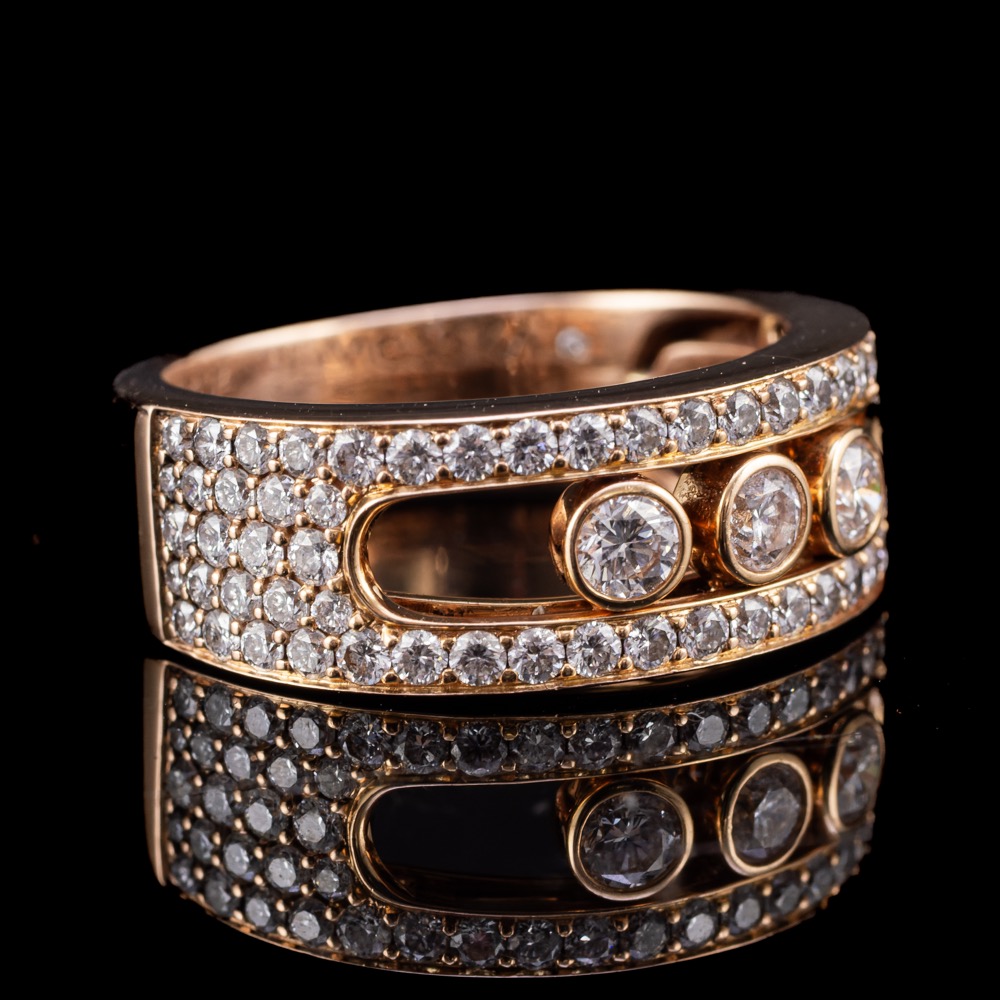 18 karátos rozéarany gyűrű briliánsokkal, Bruttó tömege: 6,2 gramm. Karikagyűrű fazonú gyűrűsín, áttört gyűrűfej, benne 3 nagyobb, arannyal lemezelt, zárt foglalatban modern briliáns csiszolású gyémánt Cca.0,30 ct (M1;W;VVs2) további 70 apró, modern briliáns csiszolású gyémán ékítés Cca.0,70 ct. Mindösszesen Cca.1,04 ct.