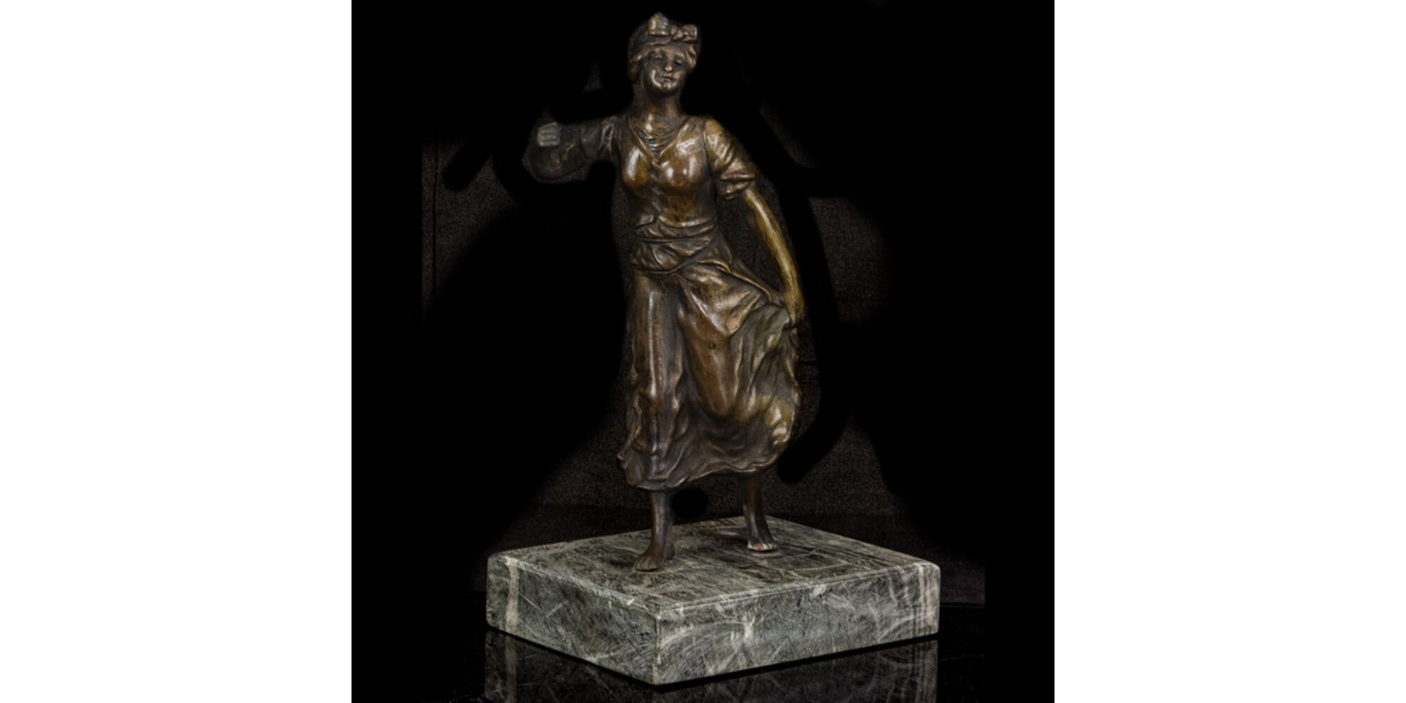 Barefoot female figure, bronze sculpture on a stone pedestal. Dimensions: 24.5 x 14 x 11 cm. Unmarked, early 20th century.