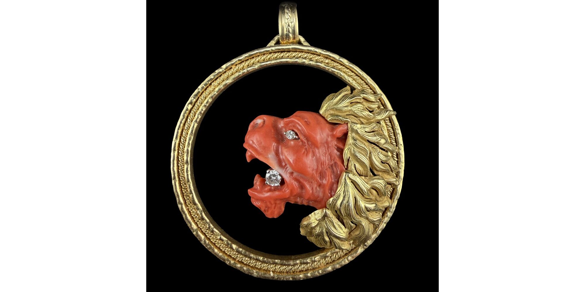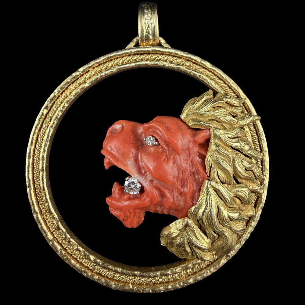 Kerek formájú, 18 karátos arany keretben korallköves oroszlán medál, Bruttó tömege: 43 gramm. Méretei: 6,5 x d: 5,5 cm. Kézzel faragott, természetes színű korall oroszlán fej, 1 nagyobb és 1 kisebb briliáns csiszolású gyémántkővel Cca.0,25 ct; (M1/F1; TCr; Vs) Jelzett: 18 karátos, 1968-tól használt olasz (Milánó) fémjellel.