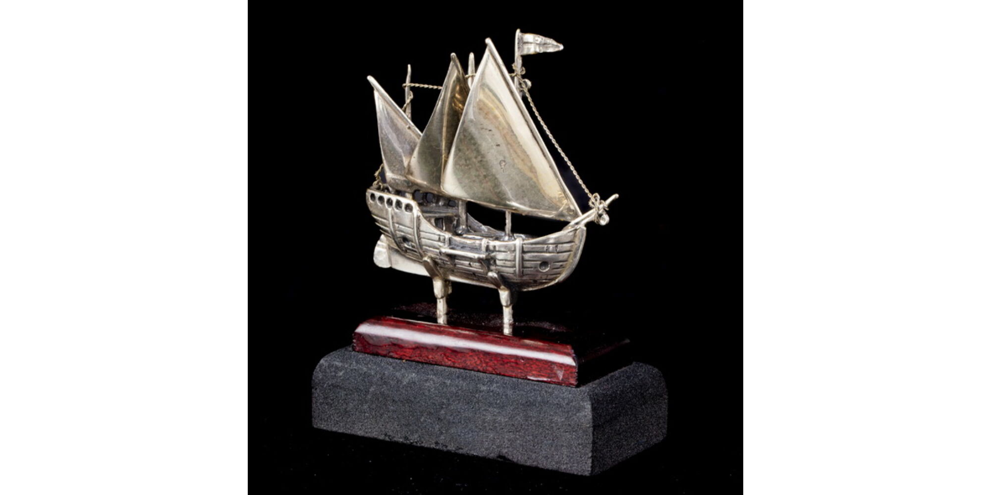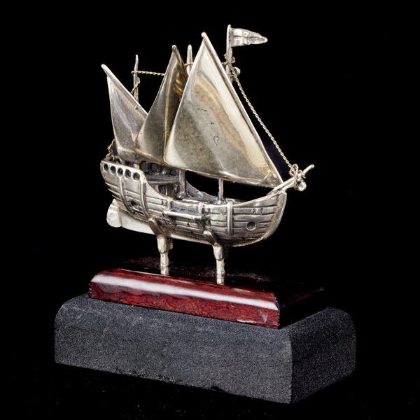 /Kolombusz hajója/:800-as finomságú ezüst, fa talapzaton.Bruttó tömege: 53,2 gramm. Méretei:8,5 x 3 x 6,5 cm. Jelzett: 1968-tól használt olasz (Arezzoi) fémjellel.