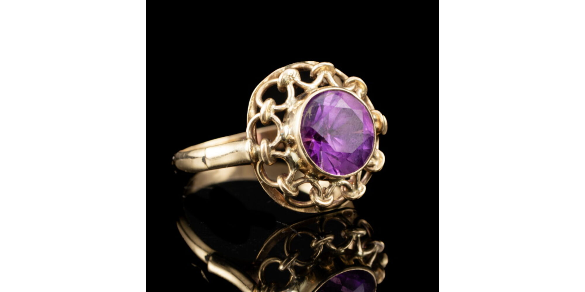 14 karátos arany női gyűrű, áttört kosaras fazonú gyűrűfejben 1 nagyobb, kerekre fazettált lila ametiszt kővel, Bruttó tömege: 3,51 gramm. Jelzett: pótlólag fémjelzett, 14 karátos arany finomság szerinti modern konvenciós fémjellel. Gyűrű méret: 58.