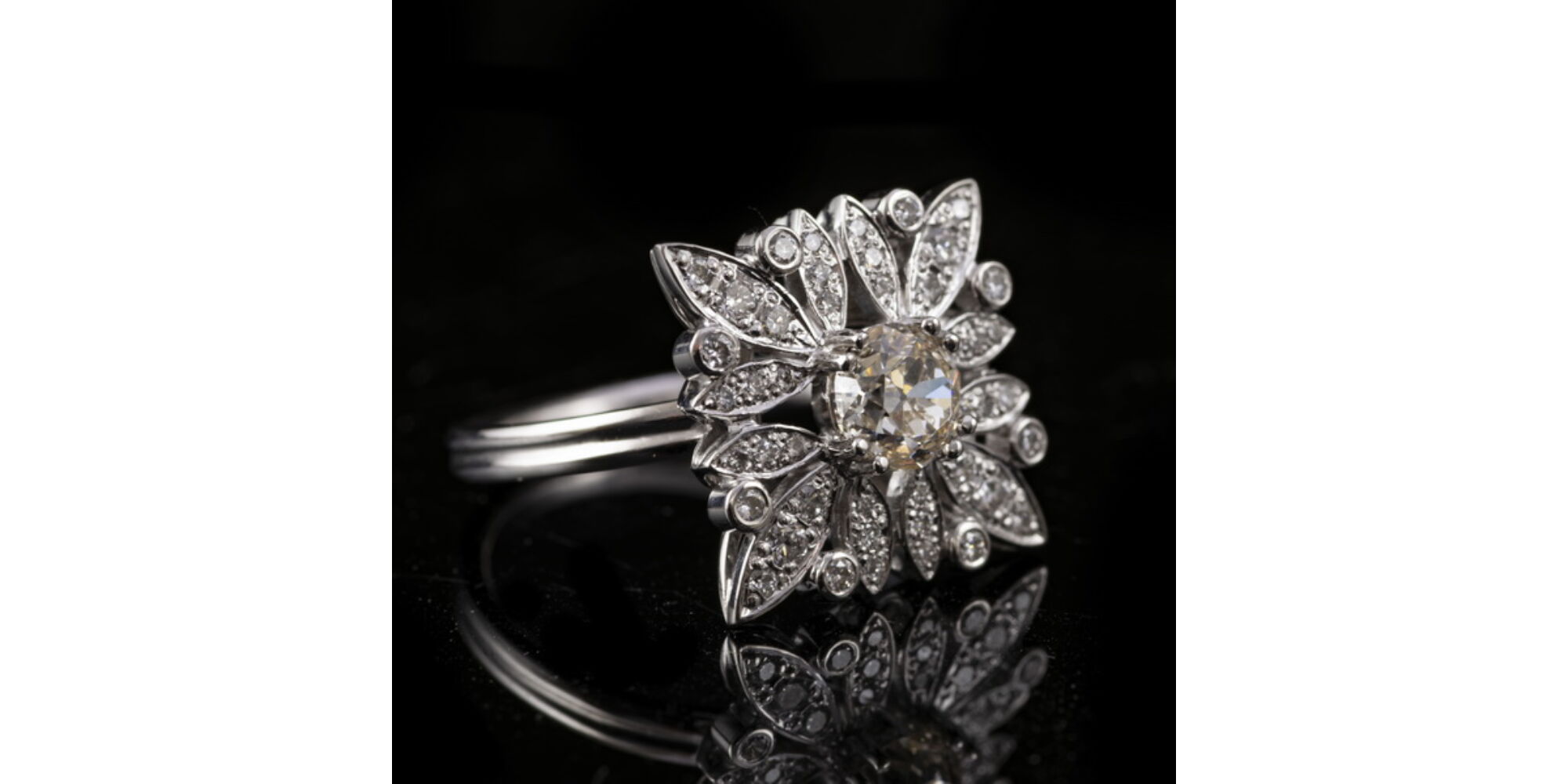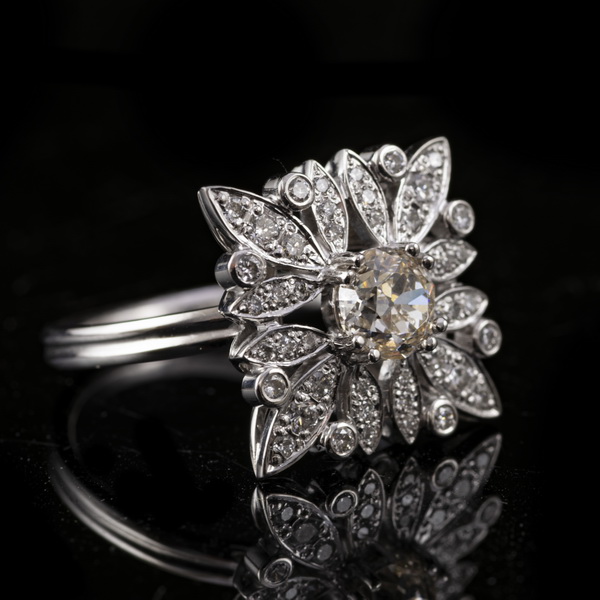 14 karátos fehérarany, 4,8 gramm. Négyszögletes margaréta formájú, áttört gyűrűfej közepében 1 nagyobb régi briliáns csiszolású gyémánt Cca.0,80 ct (R1;TC;VVs) körülötte 44 apró briliáns csiszolású gyémánttal Cca.0,418 ct (M1;W;VVs). Jelzett: 2016-tól használt magyar fémjellel. Gyűrű mérete:53.