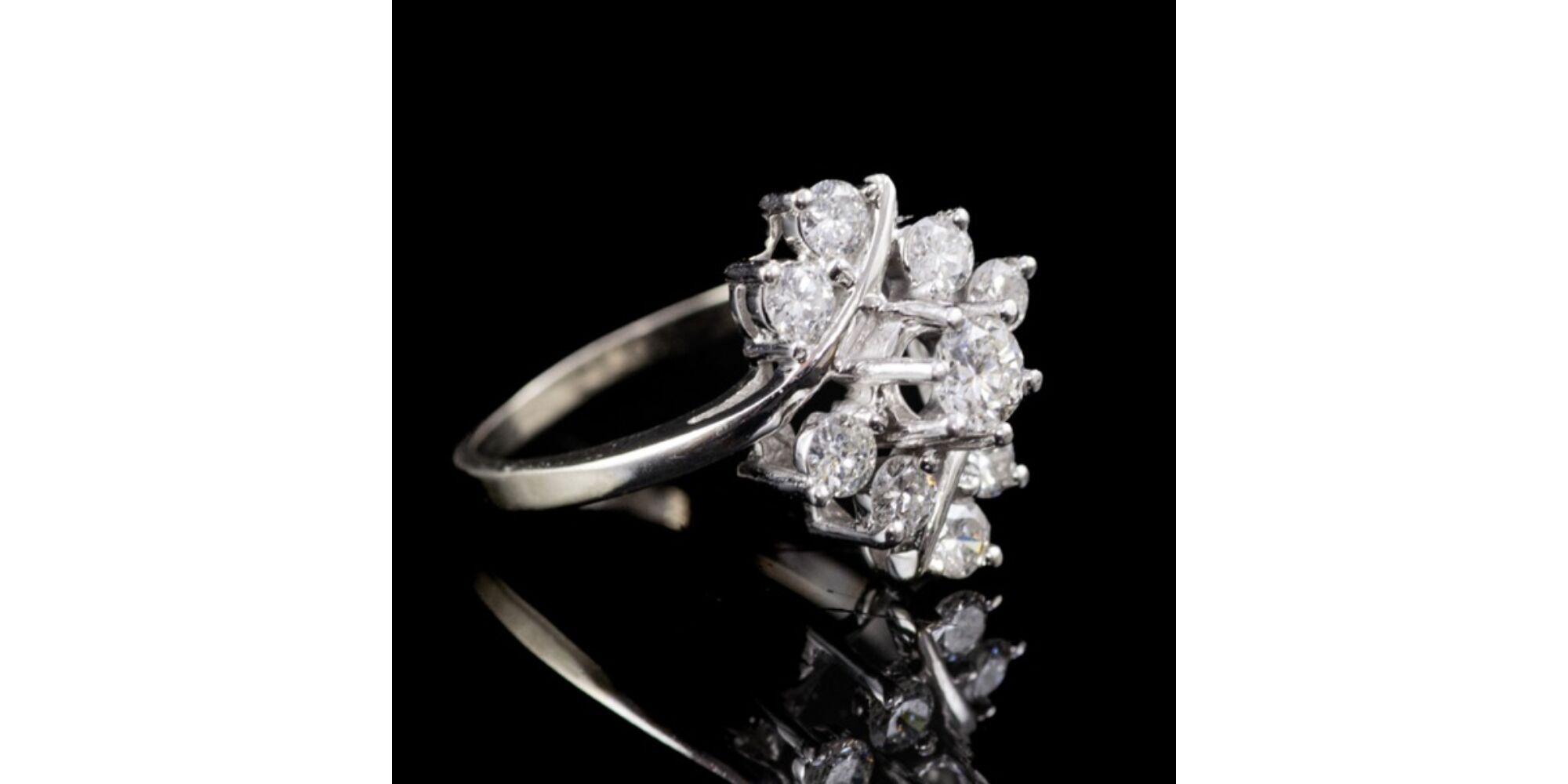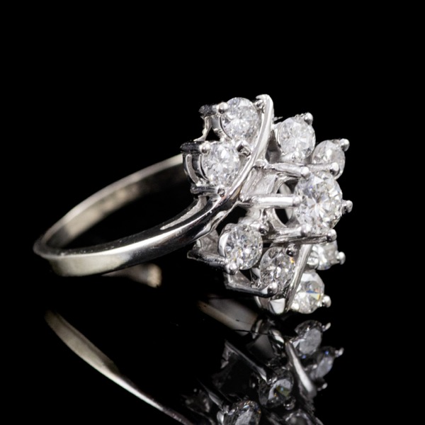 14 karátos fehérarany gyűrűsín, Bruttó: 4 gramm. Karmos foglalatban 9 modern briliáns csiszolású gyémánt Cca.1,10 ct. (M1;TCr;Vs-Si1) Jelzett: 14 k jelzéssel. Gyűrű mérete:58.