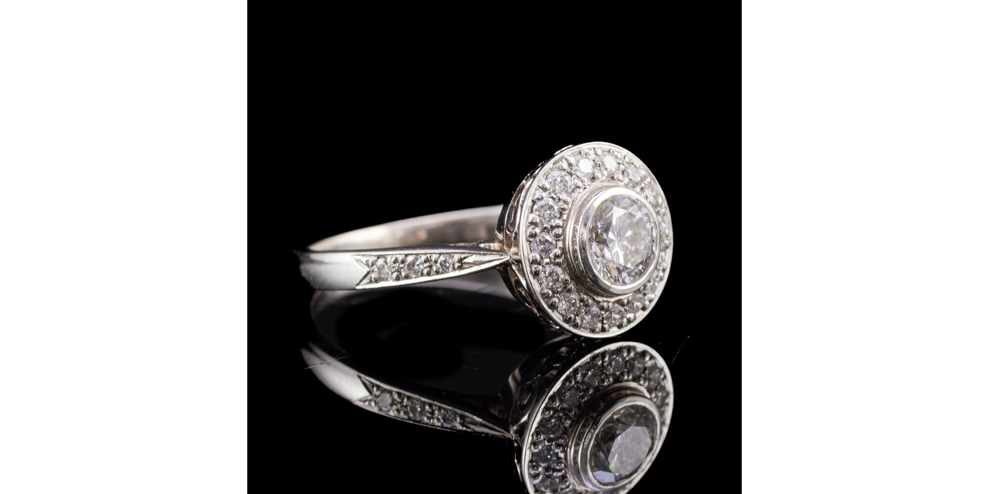 Modern rozetta fazonú, 18 karátos fehérarany gyűrű, Bruttó tömege:3,5 gramm. Kerek formájú gyűrűfej közepében arannyal lemezelt, zárt foglalatban 1 modern briliáns csiszolású gyémánt Cca. 0,685 ct; (M1; W; VVs) körben és gyűrűvállakon további 22 kisebb briliáns csiszolású gyémánt Cca. 0,2 ct. Jelzett: 2006-16 között használt magyar fémjellel, valamint gyűrűsín belsejében "0,885 ct". Gy.M: 55.