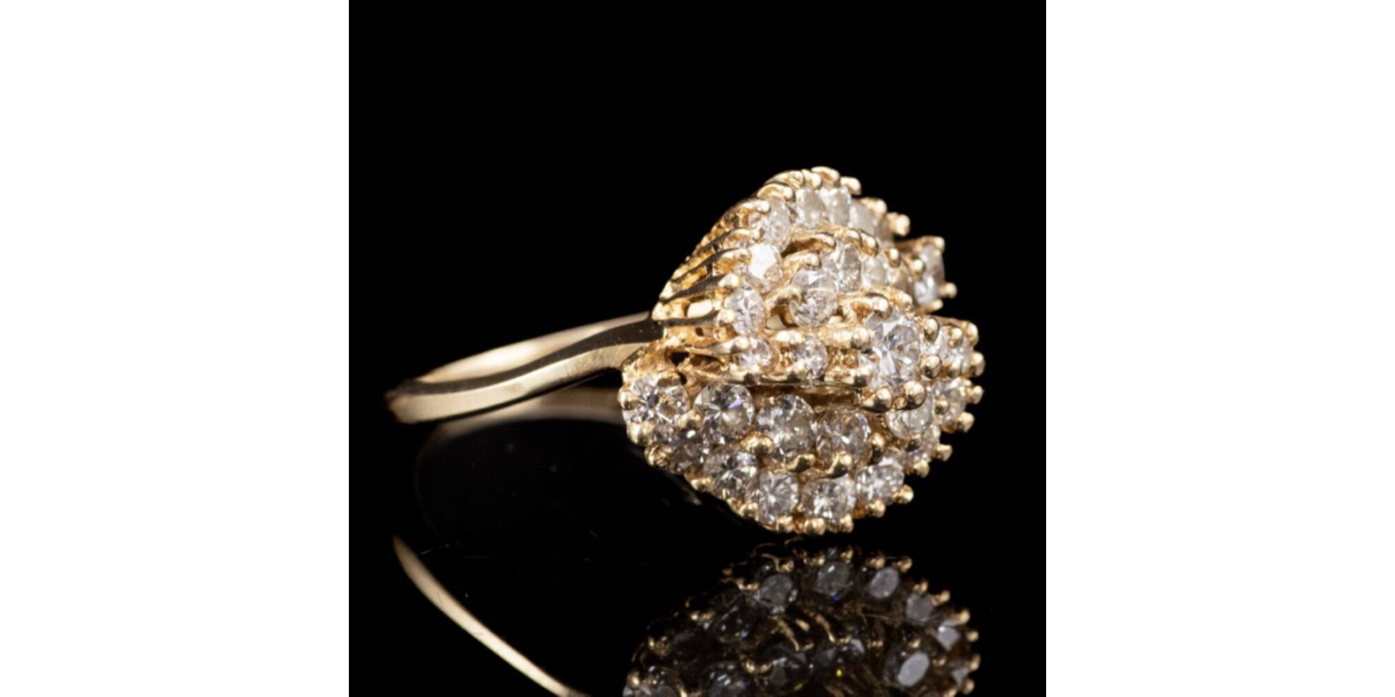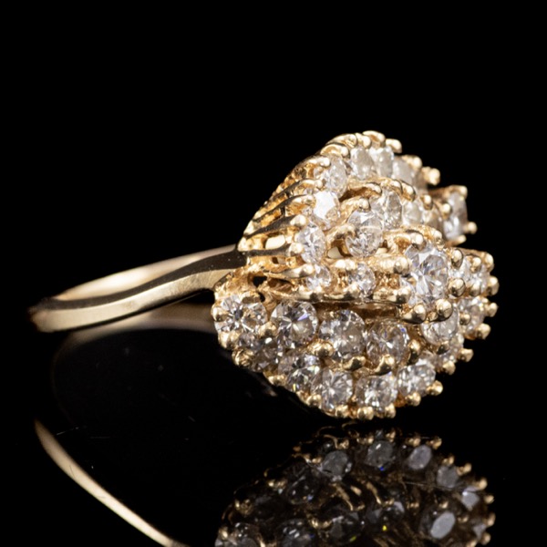 14 karátos arany gyűrű, bruttó tömege:5,28 gramm. Kerek formájú gyűrűfejben 29 darab különböző méretű, lépcsőzetes elrendezésű, karmos foglalású, modern briliáns csiszolású gyémántokkal, mindösszesen Cca.:1,60 ct. (M1;TCr;Vs) Jelzett: 2016-tól használt magyar fémjellel, valamint gyűrűsín belső felületén "AA 1,60 " jelzéssel. Gyűrű mérete:56.